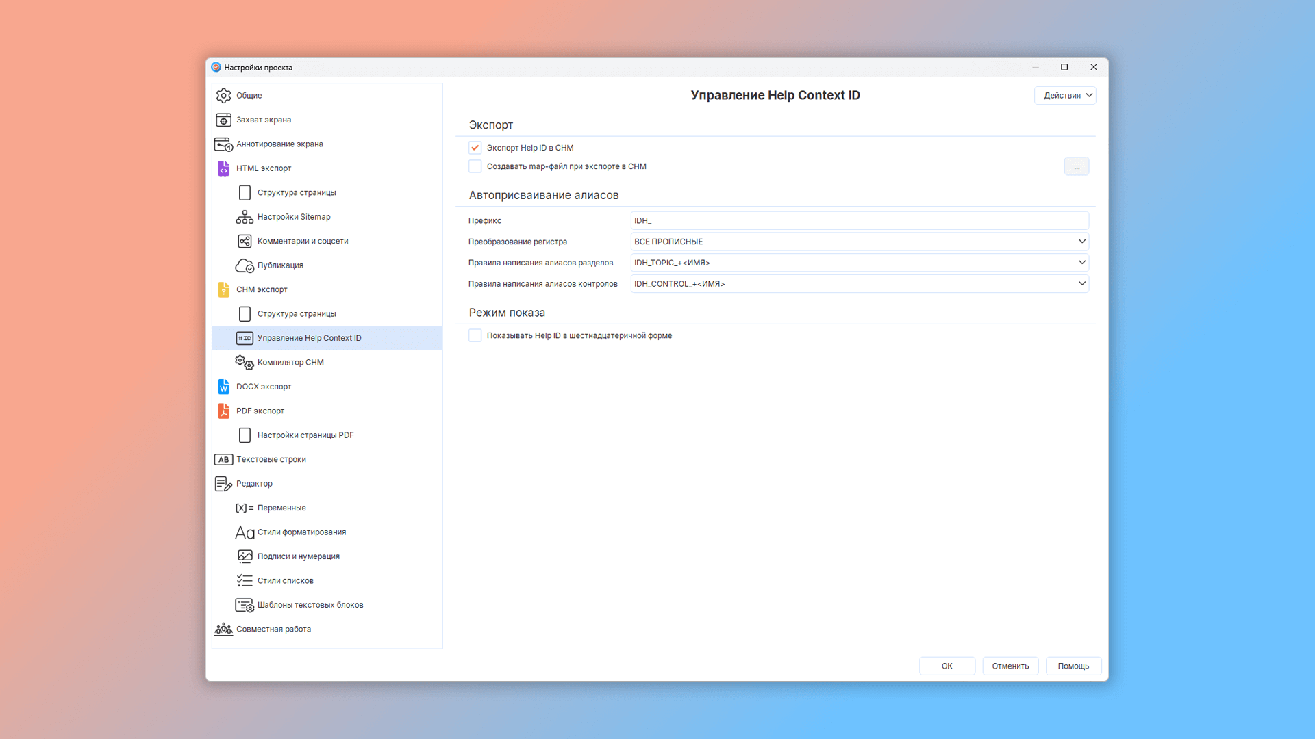 Чтобы изменить настройки управления Help Context ID при экспорте в CHM для текущего проекта, используйте один из описанных ниже способов: