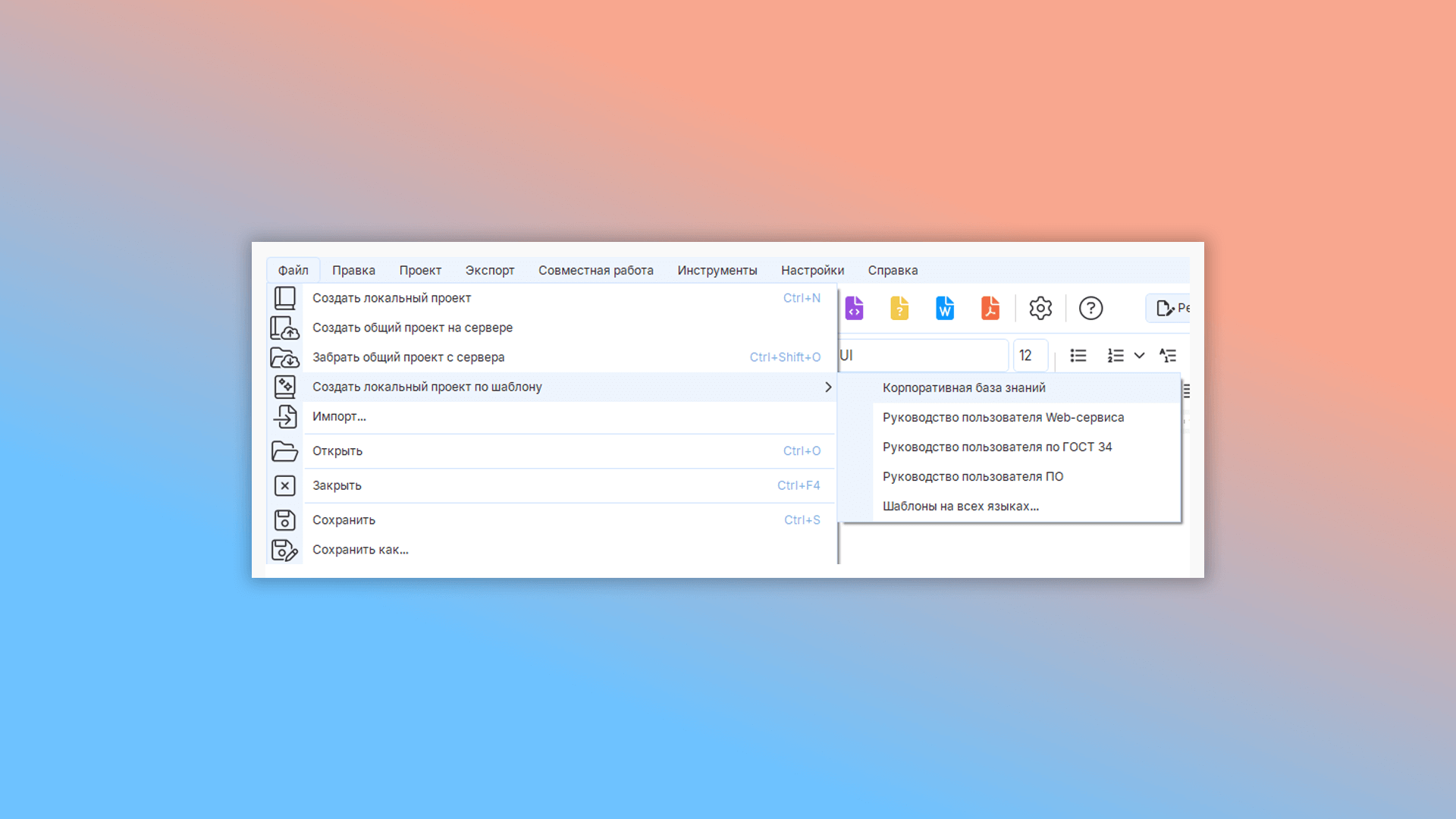 Для того, чтобы создать шаблон корпоративной базы знаний, нужно при запуске программы в главном меню открыть пункт "Файл", далее "Создать локальный проект по шаблону" и выбрать "Корпоративная база знаний".