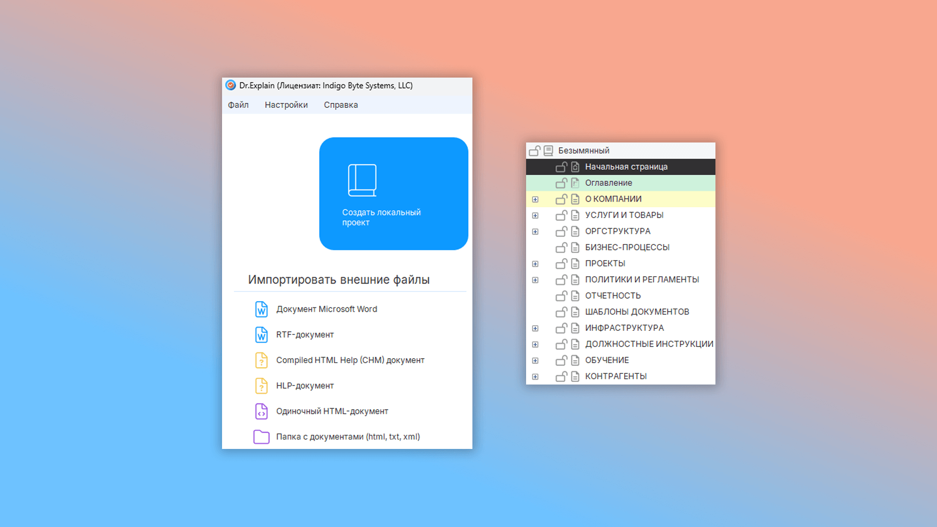 Чтобы сделать в программе печатную документацию, создайте проект в главном меню и распишите основные разделы будущего руководства. Воспользуйтесь готовыми шаблонами руководств, если не хотите сами придумывать структуру документации. Предлагаемые шаблоны в программе Dr.Explain являются лишь экспертной рекомендацией, обобщающей наш многолетний опыт работы в области технического писательства. Структура и содержание разделов в шаблонах не являются абсолютными или строго обязательными. Вы можете свободно модифицировать шаблоны под специфику вашего программного продукта.