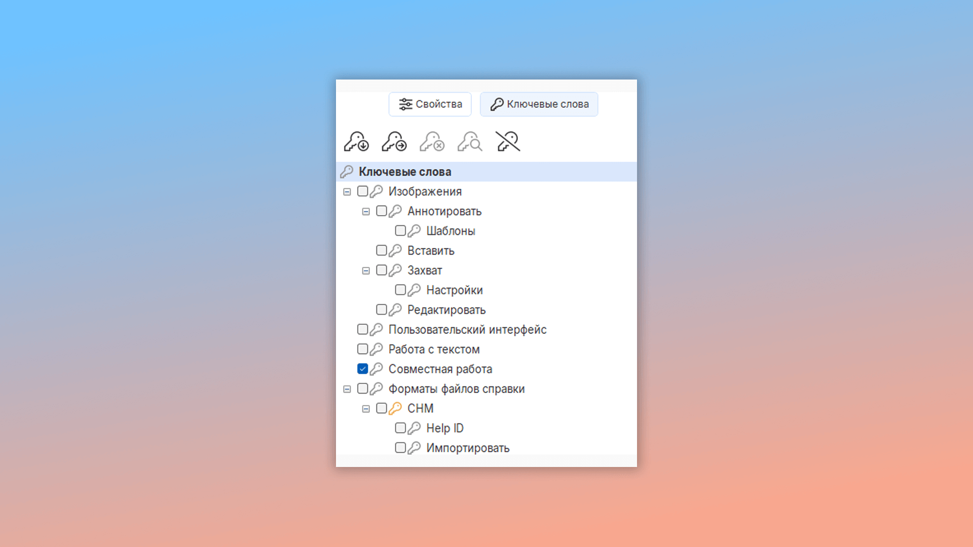 Выберите страницу в дереве проекта и задайте ключевые слова, которые вы хотите связать с этой страницей. Для этого отметьте их галочками. Добавляйте или удаляйте ключевые слова при помощи кнопок на панели инструментов.