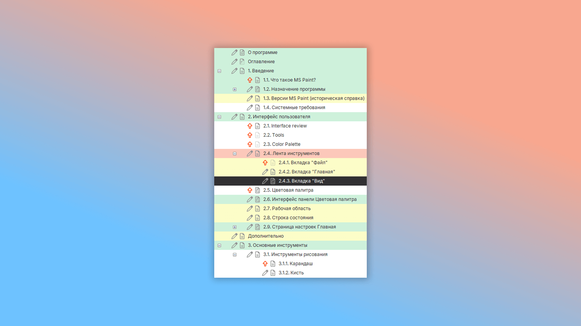 Данная функция сделает из структуры еще не готовой документации тепловую карту, на которой будет показан прогресс всех частей вашего проекта. Благодаря статусам разделов вы сможете отслеживать процесс написания документации и планировать дальнейшую работу.