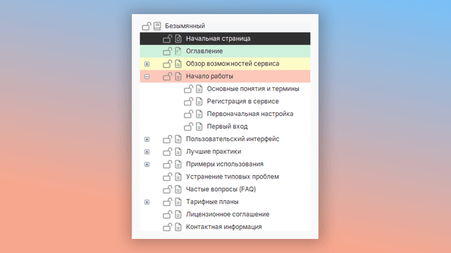Шаблон руководства пользователя — это способ сэкономить время на старте, особенно при создании первичной структуры проекта. Содержание разделов в новом проекте уже частично заполнено текстовым и графическим контентом, предлагая пользователю сразу приступить к наполнению контента конкретной специфической информацией о web-сервисе.