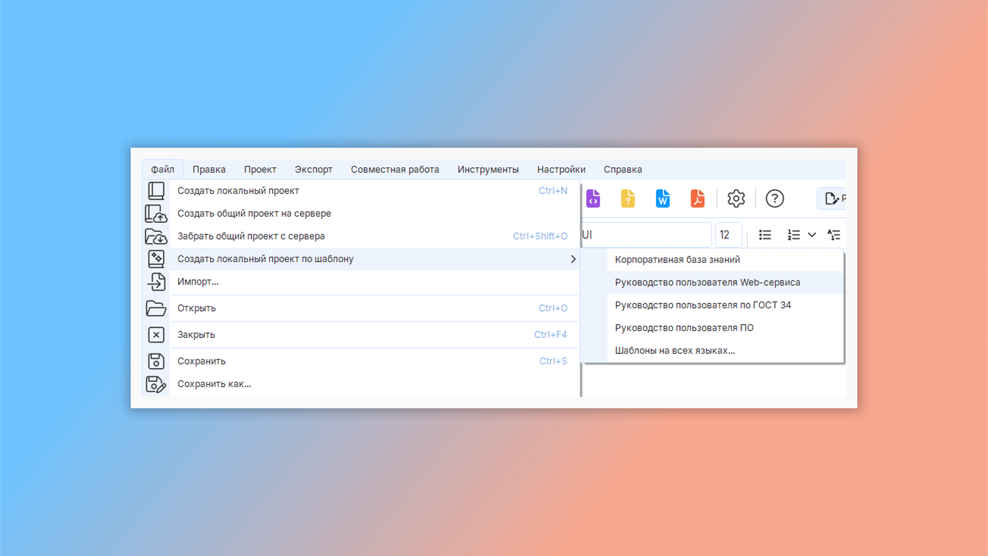 Для того, чтобы создать шаблон руководства пользователя, нужно при запуске программы в главном меню открыть пункт "Файл", далее "Создать локальный проект по шаблону" и выбрать "Руководство пользователя Web-сервиса".