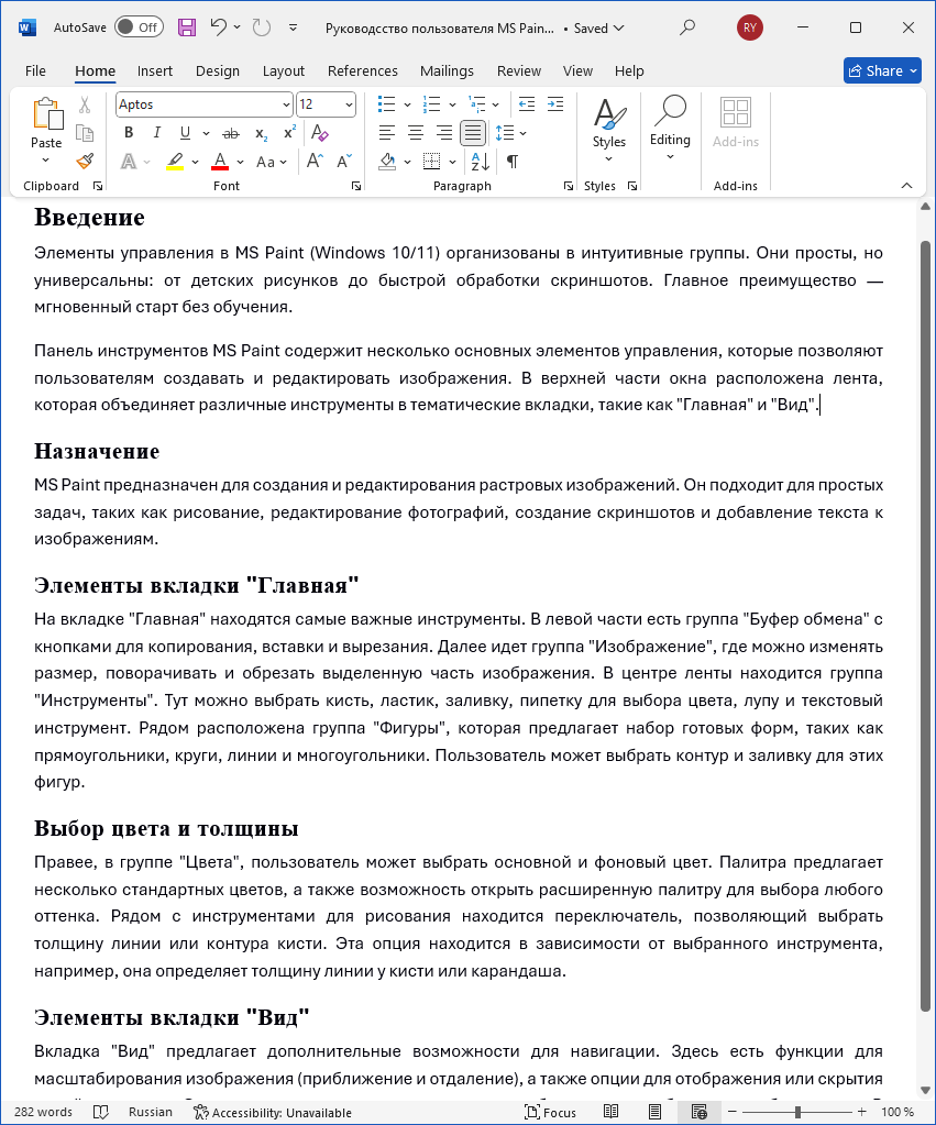 Ниже приведен скриншот RTF-документа. В нем один заголовок первого уровня (стиль "heading 1") и четыре заголовка второго уровня (стиль "heading 2"):