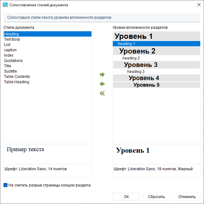 Запустим импорт этого RTF-документа в Dr.Explain. В диалоге сопоставления стилей выделим "heading 1" слева и Уровень 1 справа, после чего нажмем иконку , что по центру диалога. "heading 1" переместится в правую часть диалога, в секцию под Уровнем 1.