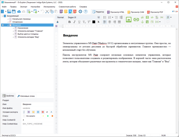 В результате импорта этого документа будет создан проект Dr.Explain с одним разделом первого уровня ("Введение"), у которого будет четыре подраздела: