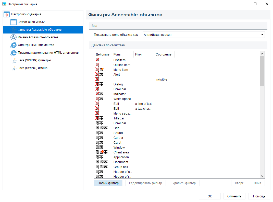 Используйте этот диалог для настройки фильтра обработки контролов для accessible-объектов, окон или контролов Java Swing.