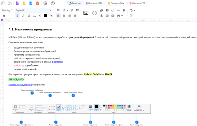 Редактор контента Dr.Explain позволяет редактировать содержимое разделов в режиме WYSIWYG1, включая растровые изображения, ссылки, аннотированные скриншоты, таблицы и прочие объекты, которые можно добавить при помощи текстового редактора.
