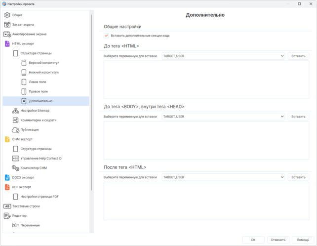 Появится окно настроек проекта. Перейдите в HTML экспорт -> Структура страницы -> Дополнительно. Активируйте флажок Вставить дополнительные секции кода: