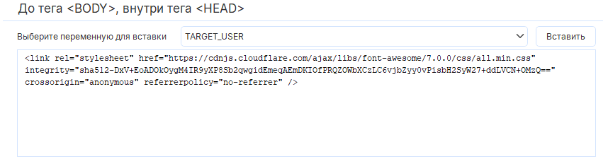 В поле До тега <BODY>, внутри тега <HEAD> вставьте скопированную ссылку: