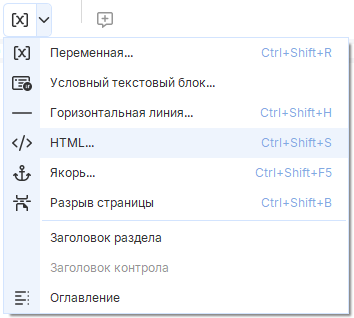 нажмите кнопку выпадающего списка рядом с иконкой Вставить переменную и выберите пункт HTML: