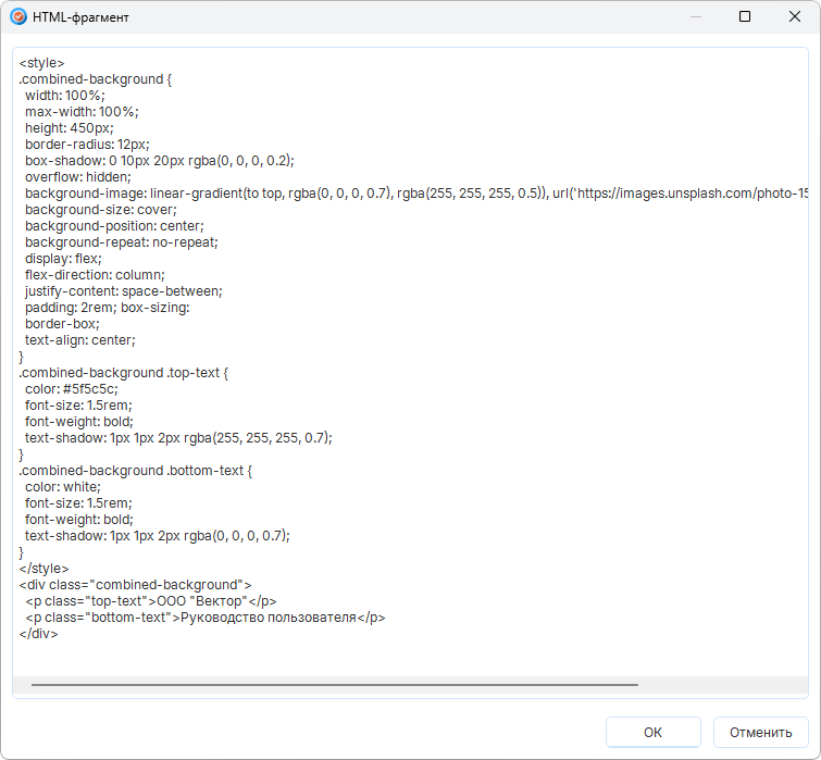 После этого вставьте код в появившемся диалоговом окне HTML-фрагмент: