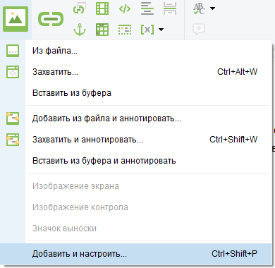в панели инструментов редактора и в появившемся меню выберите пункт Добавить и настроить или нажмите сочетание клавиш Ctrl+Shift+P: