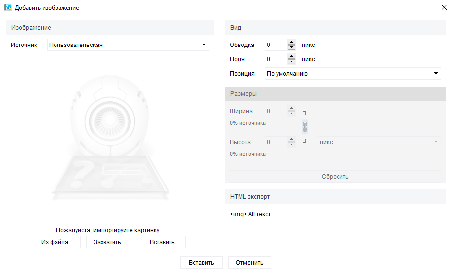 Используйте этот диалог для выбора нужного файла изображения или создания нового скриншота и задания его свойств.