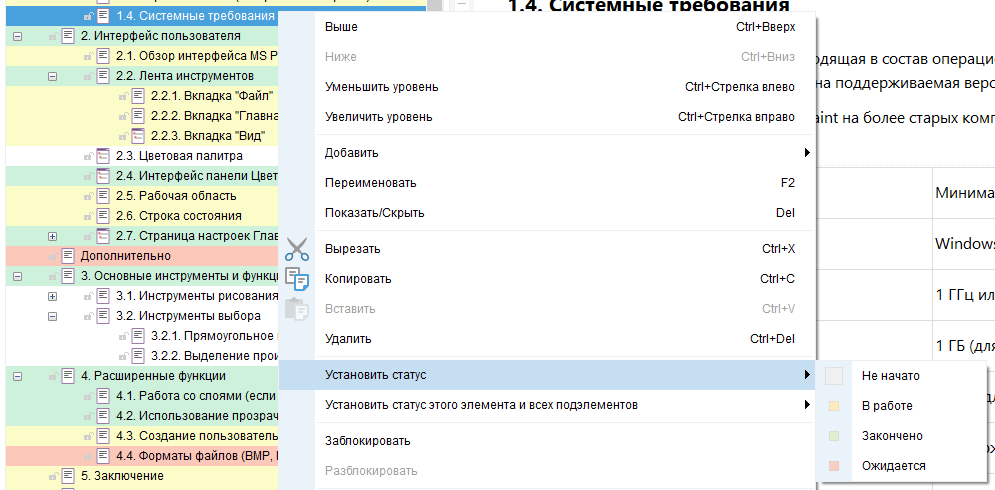 Статусы позволяют помечать разделы в дереве проекта по признаку их завершенности: