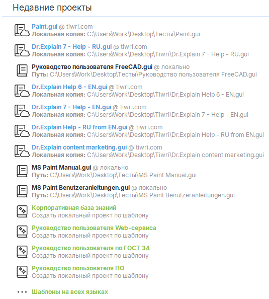 Шаблоны проектов, представленные в программе Dr.Explain, содержат готовые структуры разделов, включающие в себя примеры контента. Dr.Explain предлагает шаблоны для разработки руководства пользователя программного обеспечения, веб-сервиса, корпоративной базы знаний, а также руководства пользователя по стандарту ГОСТ 34.