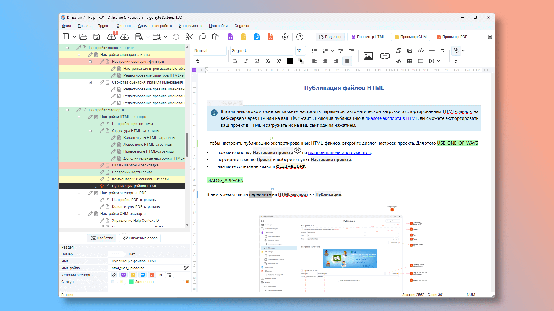 *. Состояние параметров экспорта HTML, RTF и CHM («Создать страницу индекса» и «Открыть документ») сохраняется в файле проекта.